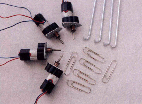 機器人對電機的要求不高,只要體積小巧、輸出軸為3mm (方便和接線端子 芯改裝的簡易軸連器連接)、轉速不要太快(比較理想的數值是20r/min以 下 ) 就 可以了。車條和曲別針是隨手可得的常見材料,接下來就考驗你的手工了。