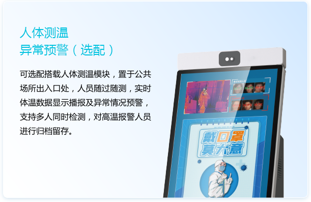 32寸主屏搭載可定制化模塊,提供迎賓接待、業(yè)務咨詢、體溫監(jiān)測等特色服務的智能大屏機器人。可實現(xiàn)接待講解、引導跟隨、宣傳巡邏等功能,還可提供人臉識別、二維碼掃描、身份證讀取、叫號、打印等特色服務。