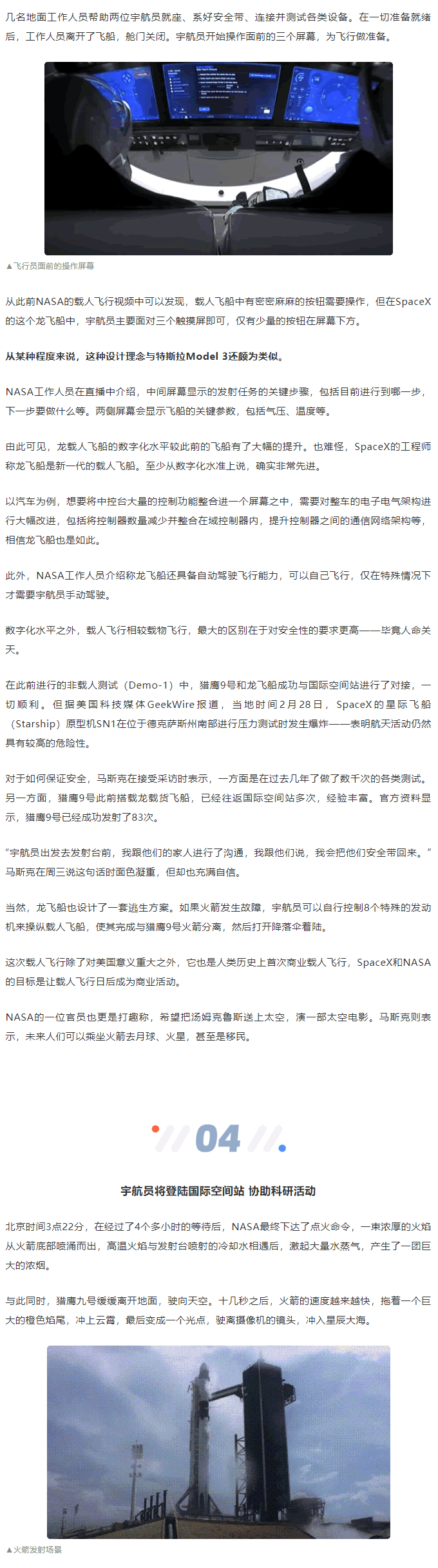 這次載人航天任務,被稱為獵鷹9號火箭龍載人飛船二次測試任務(Falcon 9’s launch of Crew Dragon’s second demonstration ,Demo-2),宇航員進入太空后,會搭乘龍飛船前往國際空間站,完成相關的任務后,兩位宇航員則將繼續乘坐龍飛船返回地球。