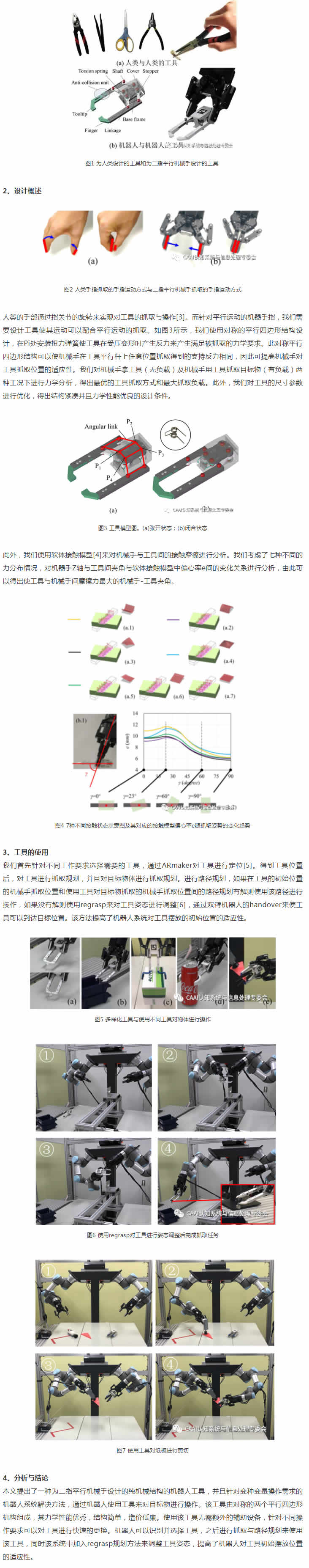 現(xiàn)代自動化生產(chǎn)中要求機(jī)器人系統(tǒng)具備一定柔性以適應(yīng)變種變量的生產(chǎn)需求。例如在機(jī)器人分揀及組裝中,機(jī)器人需要快速處理各式不同的物體。使機(jī)器人系統(tǒng)可以穩(wěn)定并且低成本的操控多種目標(biāo)物體是實現(xiàn)新一代G效自動化生產(chǎn)的重要研究目標(biāo)。目前機(jī)器人系統(tǒng)針對多種物體的操作,主要通過機(jī)械手/手指更換設(shè)備或多功能機(jī)械手來實現(xiàn)[1][2]。然而機(jī)械手/手指更換設(shè)備需要部署輔助控制設(shè)備和外部能源供給,這增加了系統(tǒng)的復(fù)雜度。同時,設(shè)備的控制與供能需要引入電纜或氣管,這會對機(jī)械臂的自由靈活運動產(chǎn)生干擾。此外,多功能機(jī)械手僅可適用于一定范圍的操作任務(wù)。對此,我們提出了讓機(jī)器人使用不同工具來操作多樣化目標(biāo)物的方法。這里提到的工具并不是機(jī)器人學(xué)中對終端執(zhí)行器的稱呼,而是同人類使用的鑷子,剪刀等工具一樣的可以被機(jī)械手直接控制的工具。此工具為復(fù)雜的變種變量的操作任務(wù)提供了一項有效的解決方案,它有如下特征:(1) 通過機(jī)械機(jī)構(gòu)實現(xiàn)機(jī)械手到工具的動力傳遞,無需外部控制及供能;(2)結(jié)構(gòu)緊湊,對機(jī)器人的避障路徑規(guī)劃影響J小;(3) 通過設(shè)計不同的工具先端實現(xiàn)可以對多種任務(wù)進(jìn)行有效配適,在更換工具時僅需要對目標(biāo)工具進(jìn)行一次抓。(4)純機(jī)械機(jī)構(gòu)設(shè)計,成本低廉,可靠性強。