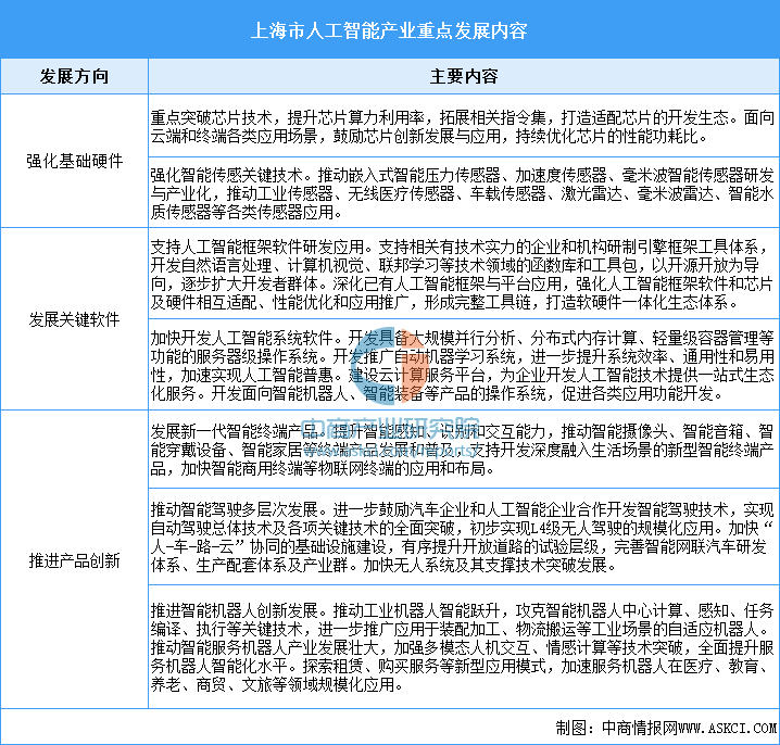 上海市將深入推動人工智能算法、算力、數據三大要素融合促進,強化基礎硬件、發展關鍵軟件、推進產品創新,夯實人工智能產業發展基礎,形成產業生態的核心優勢。