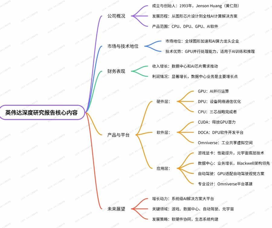 英偉達(NVIDIA)是L先的人工智能和圖形處理器公司,由黃仁勛等人于1993年創立。公司從圖形芯片設計起家,現已發展為提供全棧AI計算解決方案的企業。隨著AI技術的快速發展,英偉達的GPU在AI服務器市場中扮演關鍵角色,特別是在并行計算和深度學習任務中。報告指出,英偉達的數據中心業務和AI芯片需求強勁,推動了公司收入和利潤的顯著增長。公司通過硬件(如GPU、DPU、CPU)和軟件平臺(如CUDA、DOCA、Omniverse)構建了強大的產品生態系統。