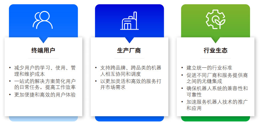 開放性的全棧式智能服務機器人生態(tài)對于整個 行業(yè)而言,是推動技術進步和市場發(fā)展的關鍵 力量。通過建立統(tǒng)一的行業(yè)標準,能夠降低技術壁壘,促進不同廠商和服務提供商之間的無縫集成。這種標準化不僅有助于確保機器人系 統(tǒng)的兼容性和可靠性,還能加速服務機器人技 術的推廣和應用,從而提升服務機器人在各個 領域的滲透率和普及度。隨著標準的統(tǒng)一,更 多的創(chuàng)新應用和服務模式得以涌現(xiàn),推動整個 行業(yè)的健康發(fā)展。