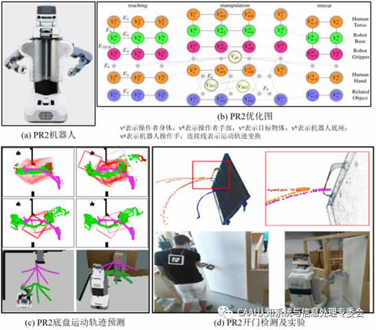 Personal Robot 2(PR2)[5]是Willow Garage開發(fā)的移動式操作機器人平臺(如圖2(a)),它配備兩個兼容7自由度機械臂和機械手,在頭部、胸部、肘部、夾爪上分別安裝有G分辨率攝像頭、激光測距儀、慣性測量單元、觸覺傳感器等豐富的傳感設(shè)備,通過底部的四輪移動平臺可無限擴展其作業(yè)范圍,提供基于Ros系統(tǒng)的仿真環(huán)境,可模擬開門、打臺球和畫畫等復(fù)雜操作,適用于科研的實驗平臺。Welschehold[6]在PR2實現(xiàn)了從人的開門操作動作示教中學(xué)習(xí)移動底盤的運動方式以及夾持器的操作姿態(tài),作者將機器人的學(xué)習(xí)分為三個部分的軌跡預(yù)測包括示教者的手部運動軌跡、示教者的身體移動軌跡以及被操作物體的運動軌跡,后通過超圖優(yōu)化方式的來預(yù)測機器人底盤運動和操作機械臂的運動軌跡(如圖2(b)-(d))。