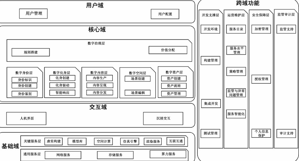 元宇宙系統架構可劃分為四個功能域和跨域功能(見圖1),包括: