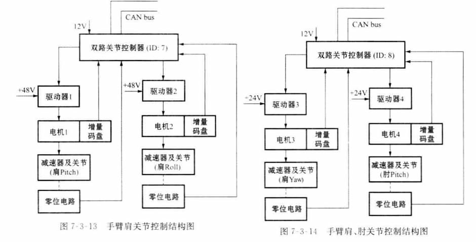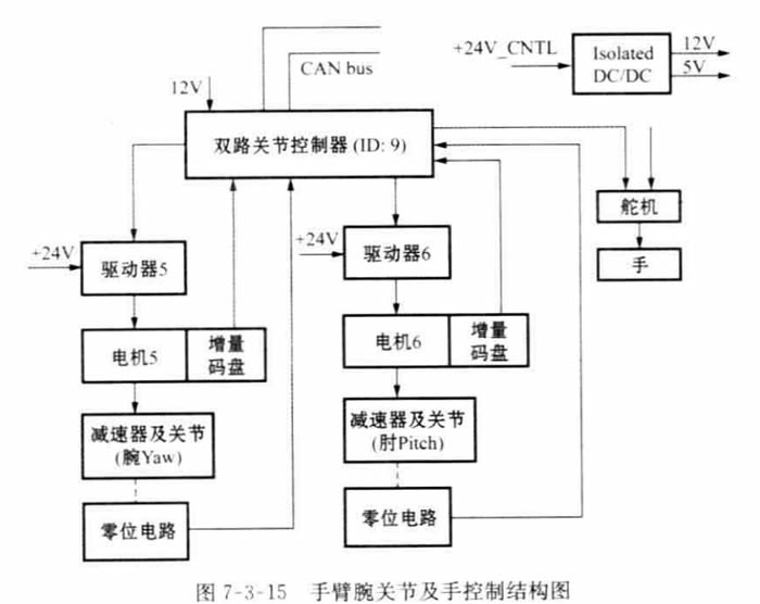 手臂各關節控制電路采用分布式控制系統,各關節控制器(主 MCU 是 TMS320LF2407)由CAN 總線相連(CAN2.0-A 版本)。控制周期為5m (即上位機 與 所 有 關 節 控 制 器 通 信 一 遍 , 再 加 一 定 裕 度 后 的 時 間 ) 。 各 關 節 控 制 電 路 結 構 如 圖7 - 3 - 13、圖7 - 3 - 14及圖7 - 3 - 15所示。