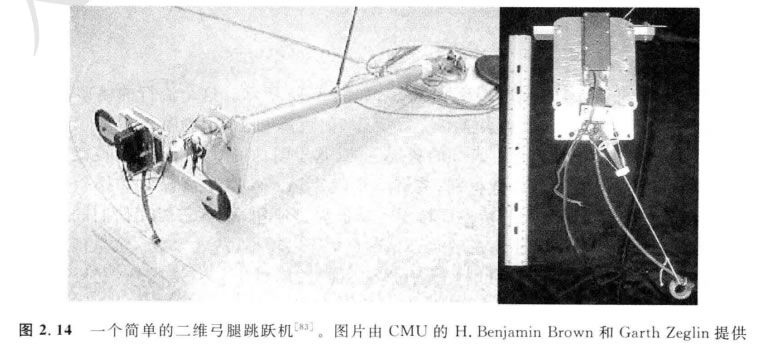 圖2.14表示的是Z近研制開發的更高效能的結構[83,它利用了設計良好的機械 動力學83。它不用外裝的液壓泵供給能量,而是設計了弓腿跳躍機,當它著地時,利 用一根有效的弓形彈簧腿來獲得機器人的動能。這個彈簧返回了幾乎85%的能量, 這就意味著每次只需要添加所需能量的15%即可穩定跳躍。這個機器人用支架沿軸 受到約束,用裝在機器人上的一組電池,已經展示能連續跳躍20 min 。和 Raibert 跳 躍機一樣,弓腿跳躍機通過在髖關節改變相對于身體的腿角來控制速度。