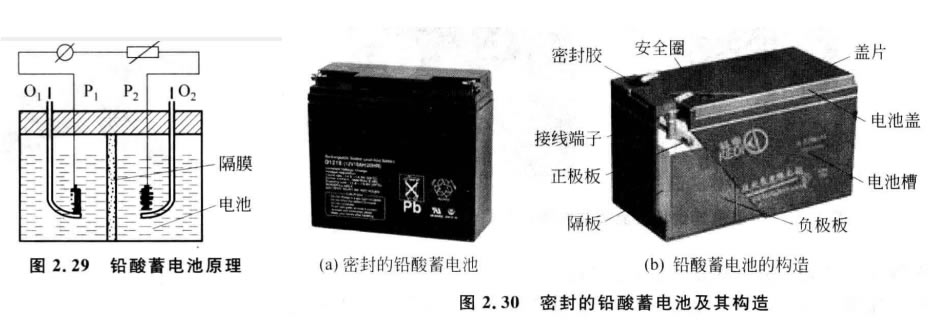 1859年,法國人普蘭特發(fā)明了鉛酸蓄電池,至今已有 150多年的發(fā)展歷程。鉛酸蓄電池在理論研究、產品種類 及品種、產品電氣性能等方面都得到了長足的進步,在交 通、通信、電力、軍事、航海、航空等各個領域,鉛酸蓄電池都 起到了不可缺少的重要作用。鉛酸蓄電池的原理和構造如 圖2.29和圖2.30所示,它是一種電極由鉛及其氧化物制成,電解液是硫酸溶液的蓄電池。鉛酸蓄電池在荷電狀態(tài)下,正極的主要成分是二氧化 鉛,負極主要成分為鉛。在放電狀態(tài)下,正負極的主要成分均為硫酸鉛。