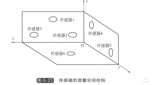 為了能用測量信息計算出相對位姿,由6個電渦流傳感器組成的特定空間結構來提供位 姿和測量數據。傳感器的測量空間結構如圖6-23所示,6個傳感器構成三維測量坐標系, 其中傳感器1、2、3對應測量面 xOy, 傳感器4、5對應測量面 xOz, 傳感器6對應測量面 yOz 。 每個傳感器在坐標系中的位置固定,這6個傳感器所標定的測量范圍就是該測量系統 的測量范圍。當測量體相對于測量坐標系發生位姿變化時,電渦流傳感器的輸出信號會隨測 量距離成比例的變化。