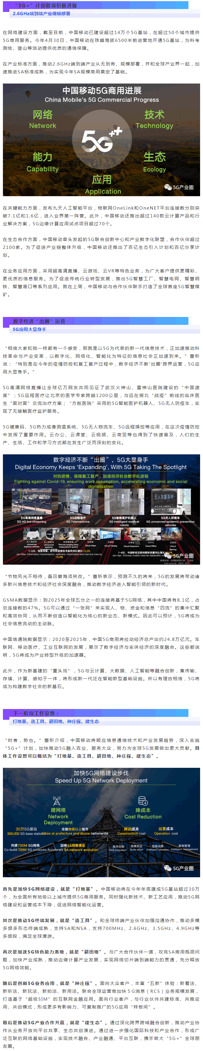 中國(guó)移動(dòng)將通過(guò)“打地基、造工具、耕田地、種莊稼、建生態(tài)”,深入實(shí)施“5G+”計(jì)劃,加快推動(dòng)5G融入百業(yè)、服務(wù)大眾。