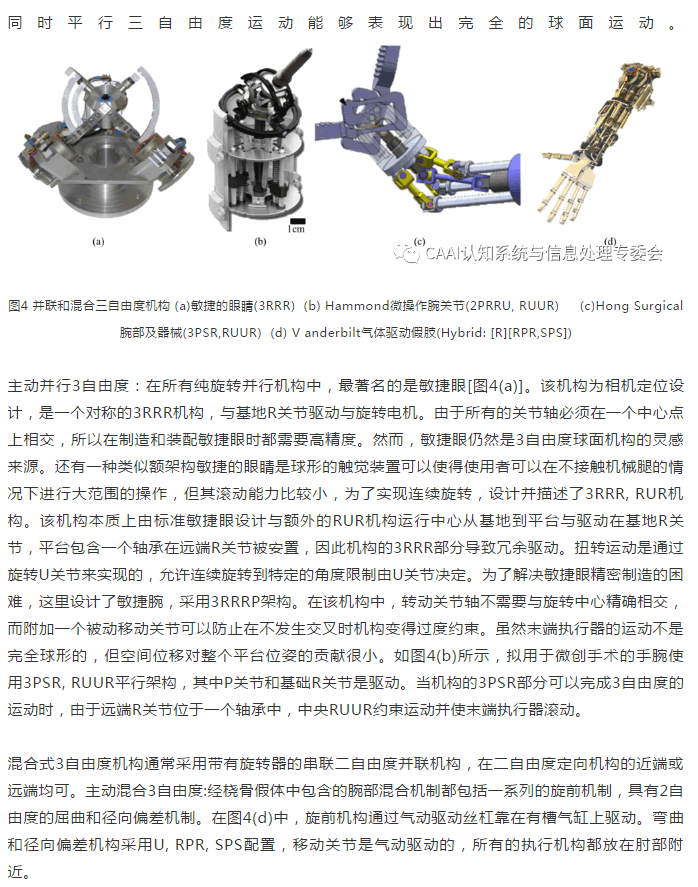 串行RRR方法在工業機械臂應用中非常普遍。許多商用工業武器,如Kuka k -16、川崎k系列、發那科M系列、DurrEcoPaint、鴻海/ Foxconnrobot arms和巴雷特WAM[圖2(b)]。這三個關節的軸在一個共同點上相交球形末端執行器運動,并為機器人手臂更近端的關節提供平移運動與球形手腕運動解耦。當兩個“滾”軸共線時,這種設計常常導致在零位置出現奇異點。然而,在包裝約束的運動范圍和靈活性(輥電機和齒輪系可以放置遠離旋轉中心)使這種配置吸引和適合工業武器。要注意的是,這些臂內的俯仰和其中一個滾轉角通常是通過傘齒輪差速器驅動的,這使得電機可以沿著腕關節的縱向放置,節省空間,并可能減少轉動慣量。滾-槳-滾設計也用于類人機器人、用于衛星服務的機器人手臂和外科機器人手腕,代替使用D二列滾動關節,一些手腕設計實現3自由度的運動通過滾動-傾斜-偏航配置。在這種情況下,偏航軸垂直于橫搖軸和俯仰軸,對應于人手腕的徑向偏差。當偏航軸與俯仰軸和滾轉軸相交時,該機構通常被認為是一個球形腕關節,也可以被認為是一個RU鏈。除了手術臂和工業臂,因為滾-滾-滾手腕與人的手腕相似,所以也經常用于人形或擬人化機械臂。一些系列腕設計選擇使用單一的球關節而不是串行鏈,雖然整體幾何形狀是一個球和窩接接頭,但球實際上是轉子,窩接接頭是定子。
