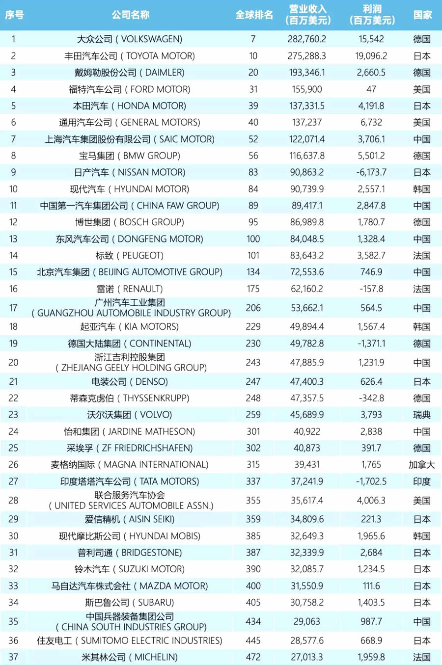 2020年,共有37家汽車企業(yè)入圍《財富》榜單,占總數(shù)的7.4%。