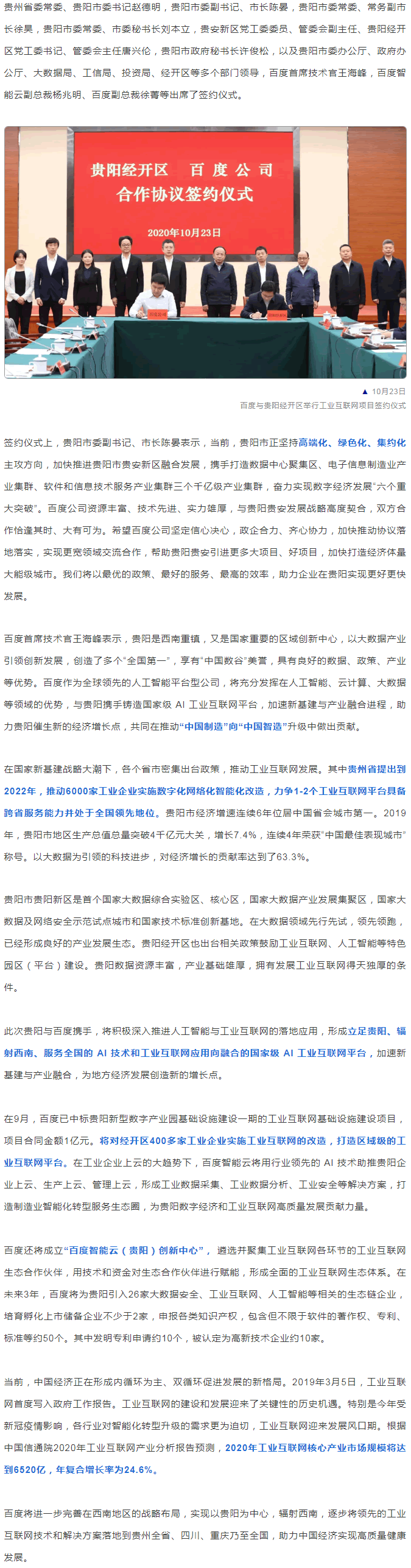 10月23日,百度與貴州省貴陽市政府正式簽署戰(zhàn)略合作協(xié)議,與貴陽經(jīng)開區(qū)舉行工業(yè)互聯(lián)網(wǎng)項目簽約儀式。百度將承接貴陽經(jīng)開區(qū)工業(yè)互聯(lián)網(wǎng)項目建設(shè),打造 AI 技術(shù)和工業(yè)互聯(lián)網(wǎng)應(yīng)用相融合的 AI 工業(yè)互聯(lián)網(wǎng)平臺,形成多面的工業(yè)互聯(lián)網(wǎng)生態(tài)體系,助力貴陽打造3個千億級產(chǎn)業(yè)集群,形成新的經(jīng)濟(jì)增長點。