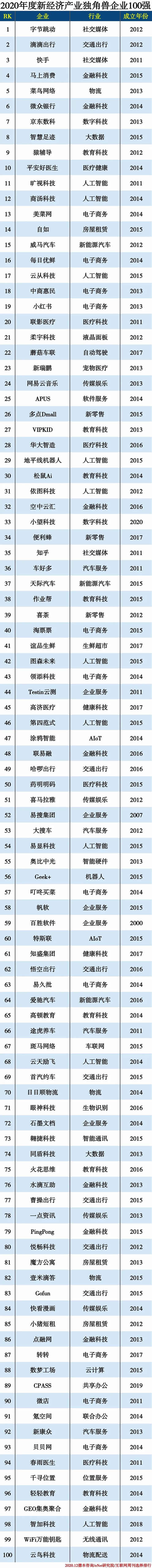 2020年度新經(jīng)濟(jì)產(chǎn)業(yè)獨(dú)角獸企業(yè)100強(qiáng)
