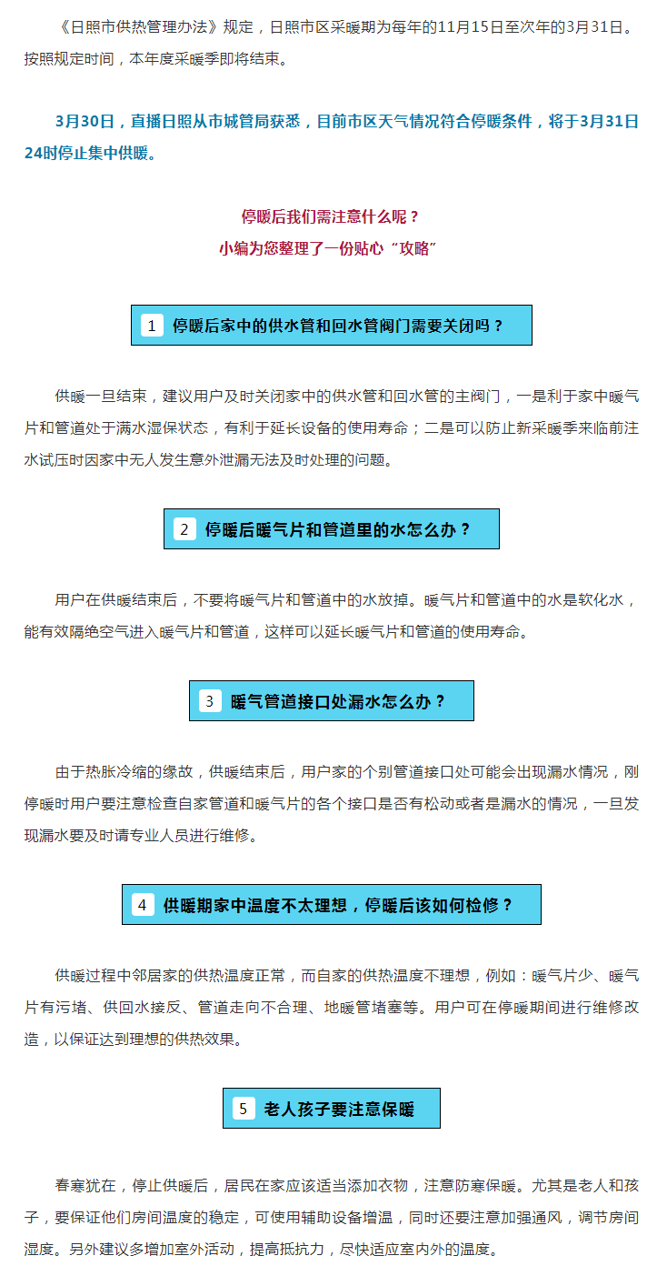 日照市區采暖供熱期為每年的11月15日至次年的3月31日。計劃試供暖時間11月1日,規定供暖時間:2020年11月15日至2021年3月15日。