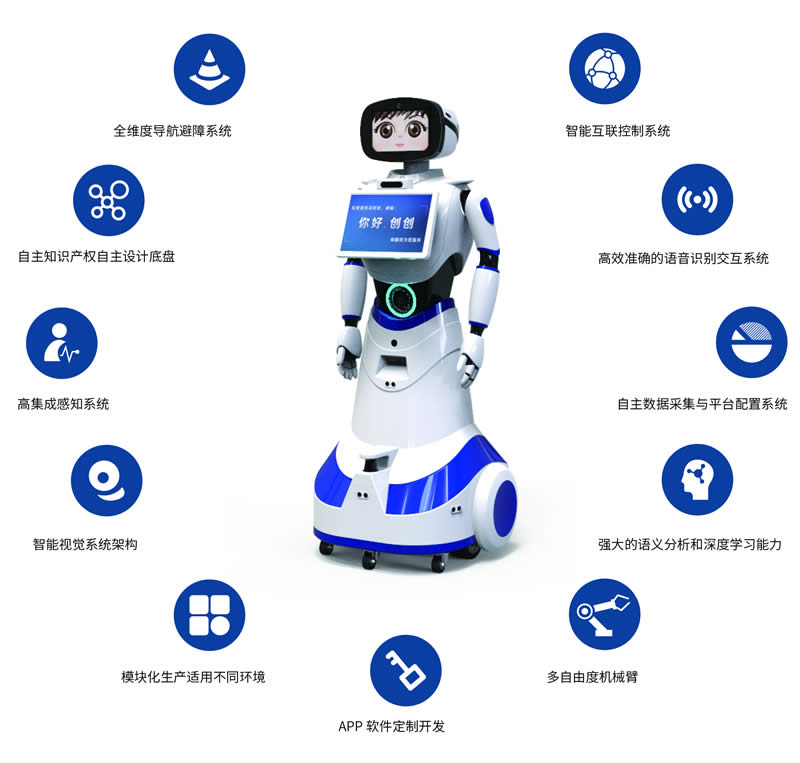 迎賓服務機器人“創創”集成人臉識別,多種傳感器感知外部環境信息,實現人類與機器人的無障礙交流