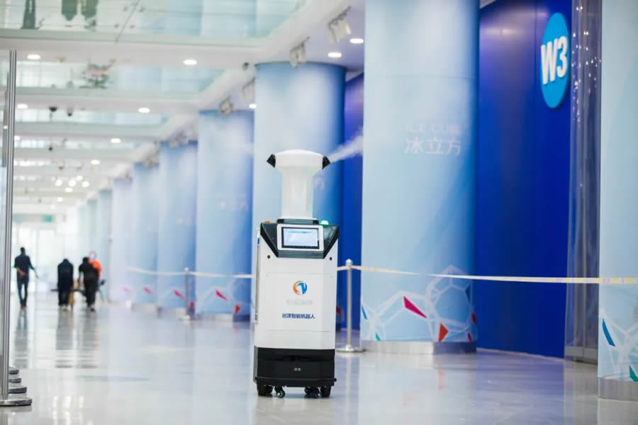 消毒機器人入駐冬奧冰立方,對公共區域的日常流動消殺,一分鐘消毒面積可達36平方米,霧化速度達到3200g/h,消殺效果非常徹底