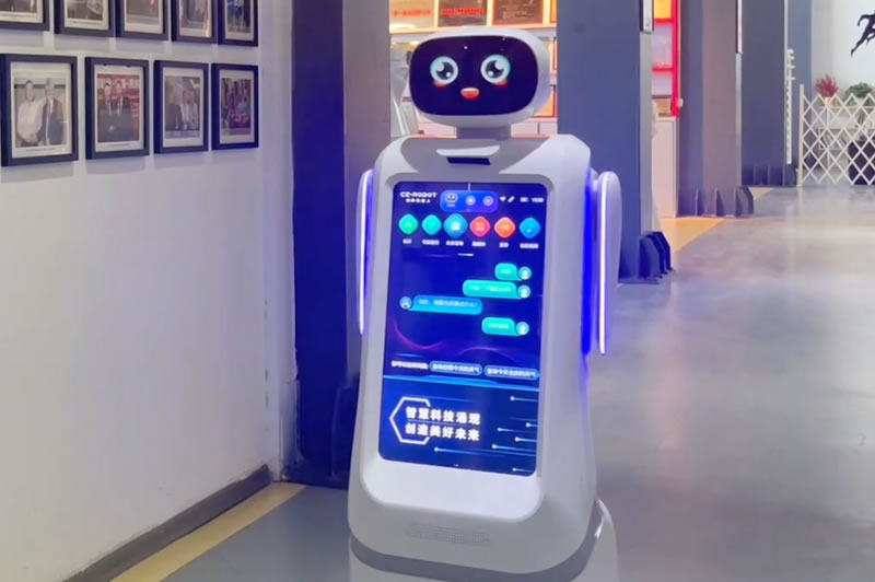 來到創澤公司前臺,一名機器人接待員便主動迎上前來,詢問你的來訪目的,還可以為你做信息登記,前臺機器人可以變身前臺接待無接觸訪客邀約又具備變身行政助理的潛能