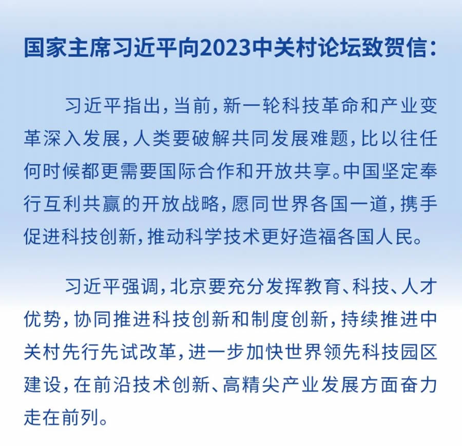2023中關(guān)村論壇由科技部、國家發(fā)展改革委、工業(yè)和信息化部、國務(wù)院國資委、中國科學(xué)院、中國工程院、中國科協(xié)、北京市政府共同主辦,25日在北京開幕。 政治局委員、北京市委書記尹力在開幕式上宣讀了主席的賀信。政治局常委、國務(wù)院副總理丁薛祥出席開幕式并致辭。 丁薛祥指出,主席專門發(fā)來賀信,充分體現(xiàn)了對科技創(chuàng)新和國際合作的G度重視。新時代十年,中國把科技創(chuàng)新擺在國家發(fā)展全局的核心地位,推動科技事業(yè)發(fā)展取得顯著成就,進入創(chuàng)新型國家行列。